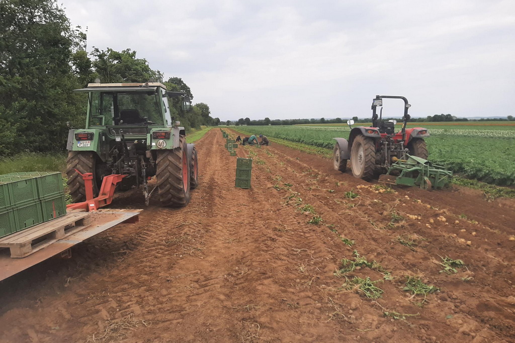 Da sich die Kartoffelpflanzen noch im vollen Wachstum befinden, habe sie keine feste Schale, sondern ein dehnungsfähiges Häutchen, das mitwachsen kann. Und deshalb sind sie auch sehr empfindlich. Der Kartoffelvollernter kann noch nicht zum Einsatz kommen. Wir ernten die Frühkartoffel mit einem kleinen Schwingsiebroder, der jeweils einen Damm durchsiebt und die Kartoffeln seitlich auf den Acker ablegt. Selbst dieser kurze Weg durch den Roder löst stellenweise das Häutchen von der Kartoffel.